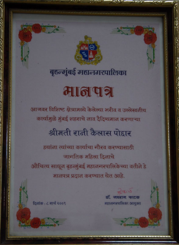 - She was awarded a trophy by the Brihan Mumbai Mahanagar Palika on Womens Day for her contribution towards the society