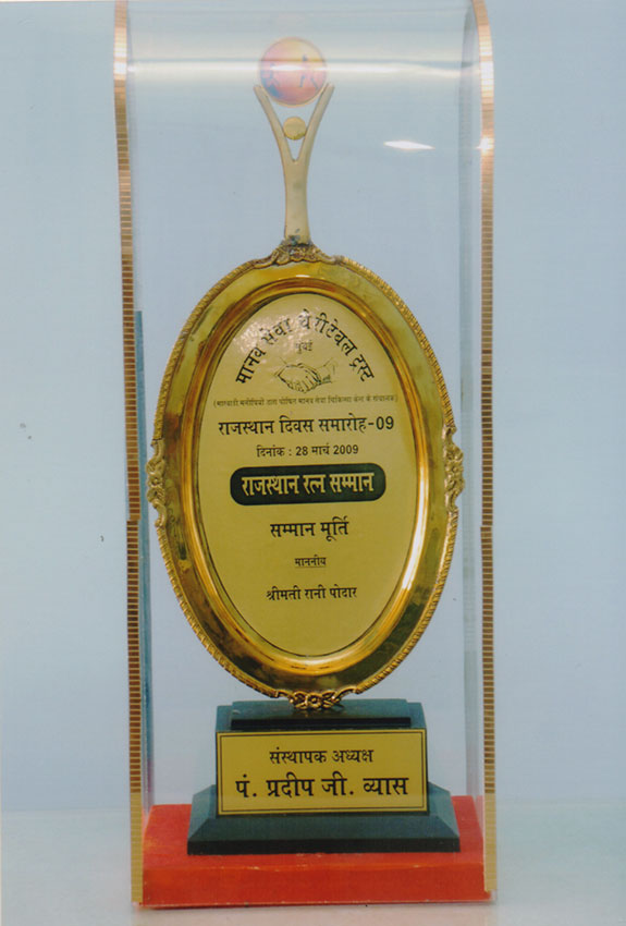 - She was awarded the Rajasthan Shiromani and Samaj Deepika Award by Rajasthani Seva Sangh, Bhayender