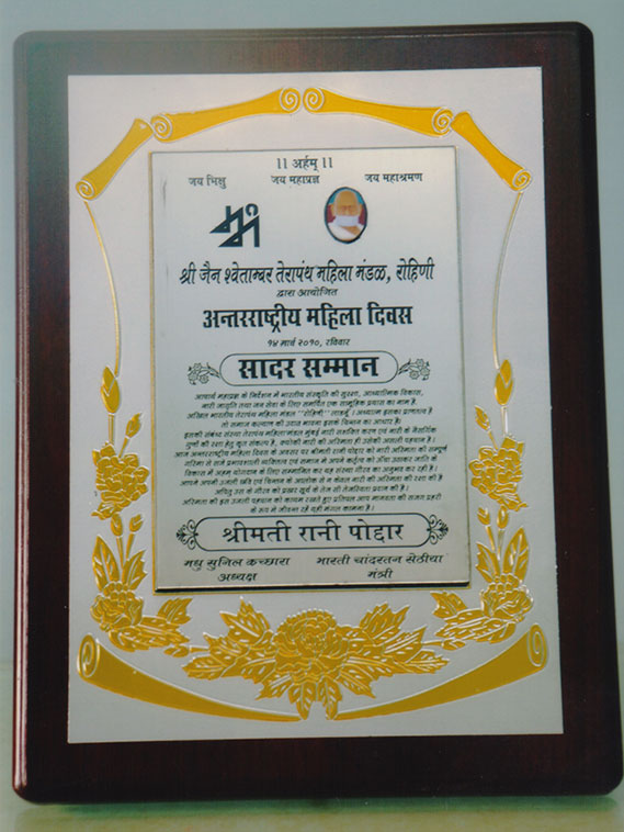 - The Jain Swetamber Terapanth in Mumbai gave her an appreciation trophy for being the outstanding citizen in various fields in 2010
